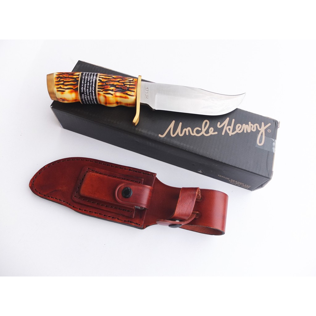美國Schrade Uncle Henry直刀獵刀7Cr17MoV高碳鋼仿鹿角柄黃銅口金腰掛皮製刀鞘【SCH171UH】