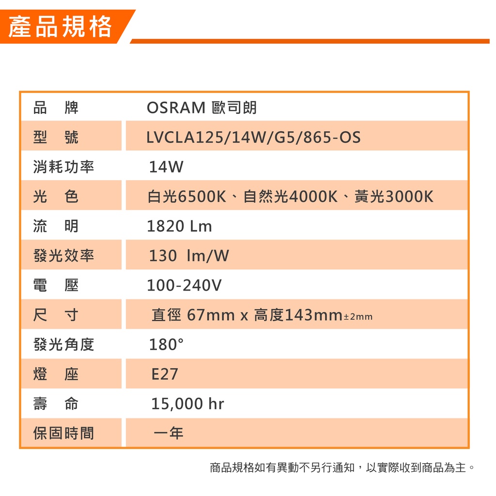 【奇亮科技】 歐司朗 OSRAM 14W LED燈泡 《白光 黃光 自然光》 E27球泡 節能標章 全電壓 含稅