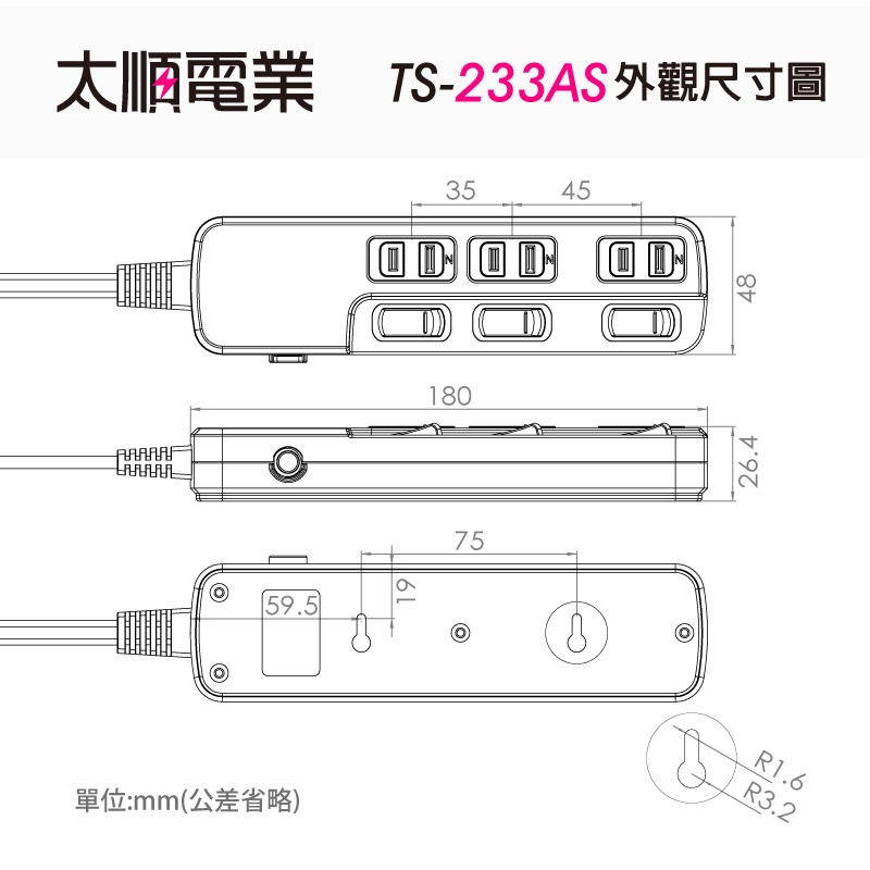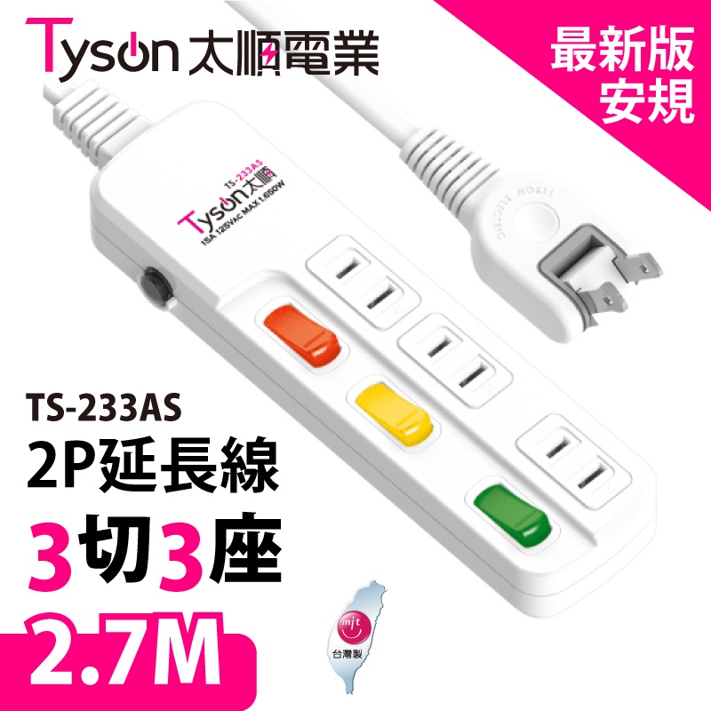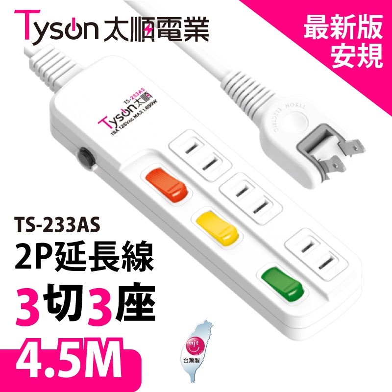 太順電業TS-233AS 2孔3開3插防雷擊延長線插座1.8M-4.5M 延長線插座 延長線