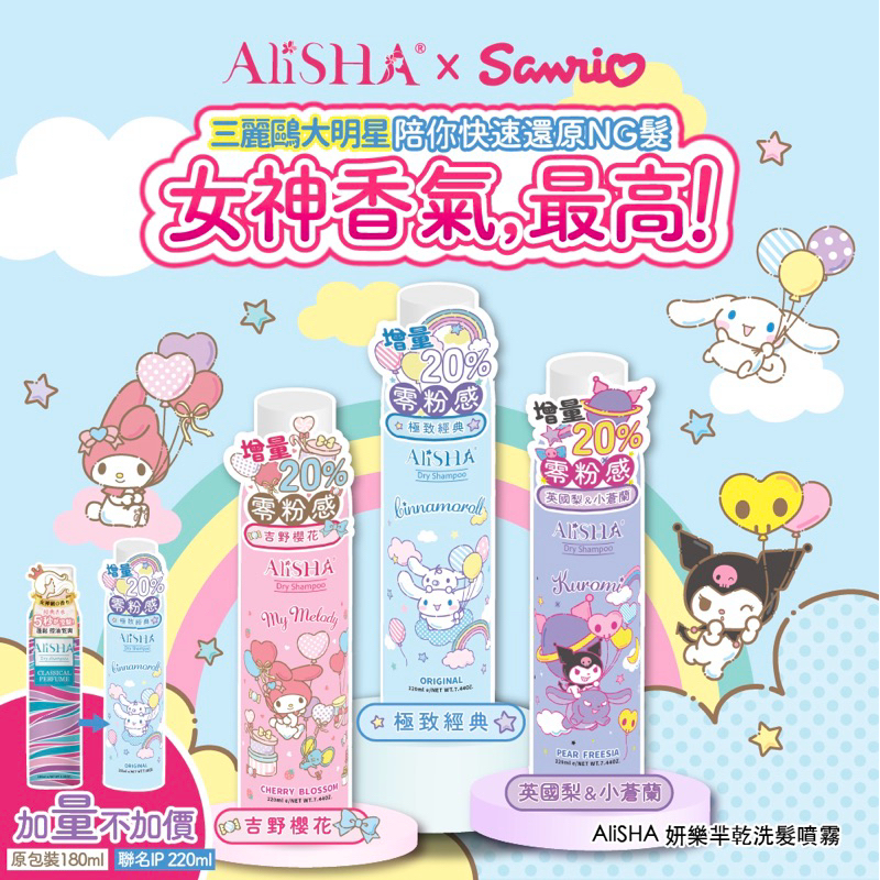 極度香氛乾爽控油~AliSHA 乾洗髮噴霧 三麗鷗限定版櫻花、經典、小蒼蘭西洋梨 (3入組)