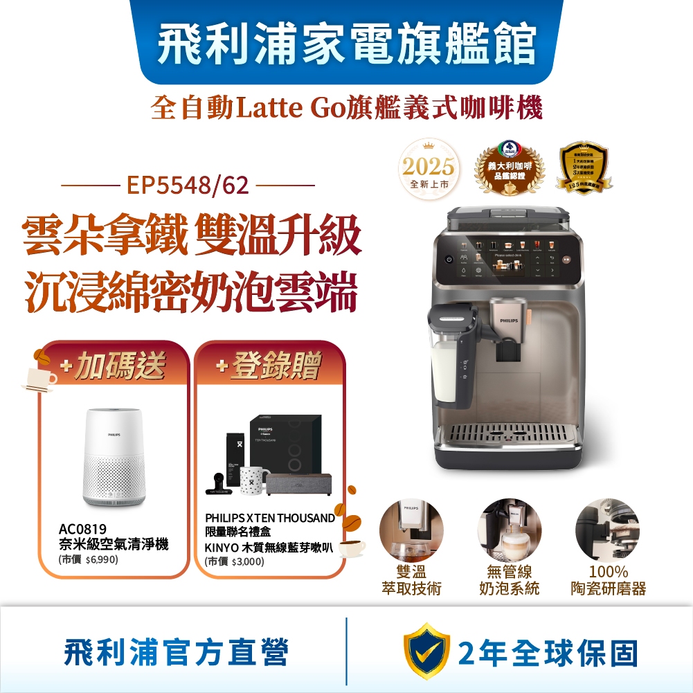 【PHILIPS 飛利浦】雙溫萃取全自動義式咖啡機(EP5548/62 暮霧灰)+贈空氣清淨機AC0819 | 精品咖啡