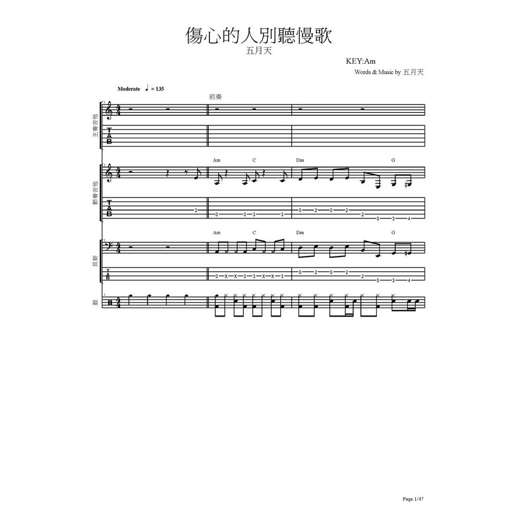 團譜 ~五月天_傷心的人別聽慢歌~[吉他譜][貝斯譜][鼓譜][樂譜]