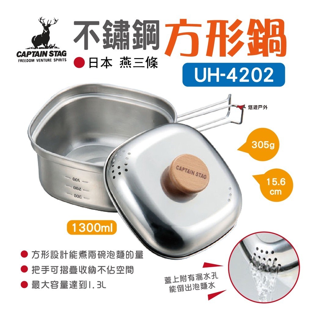 【鹿牌】日製不鏽鋼方形鍋1.3L UH-4202 湯鍋 泡麵鍋 燕三条 露營 悠遊戶外