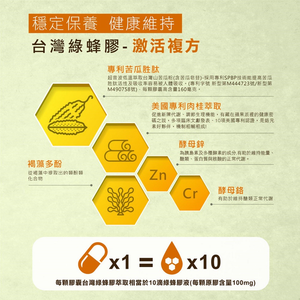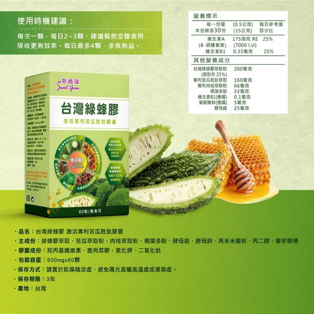 Sweet Gum 斯薇康 台灣綠蜂膠激活專利苦瓜胜肽膠囊60粒x1盒-含台灣綠蜂膠萃取+專利山苦瓜(市價$1980)
