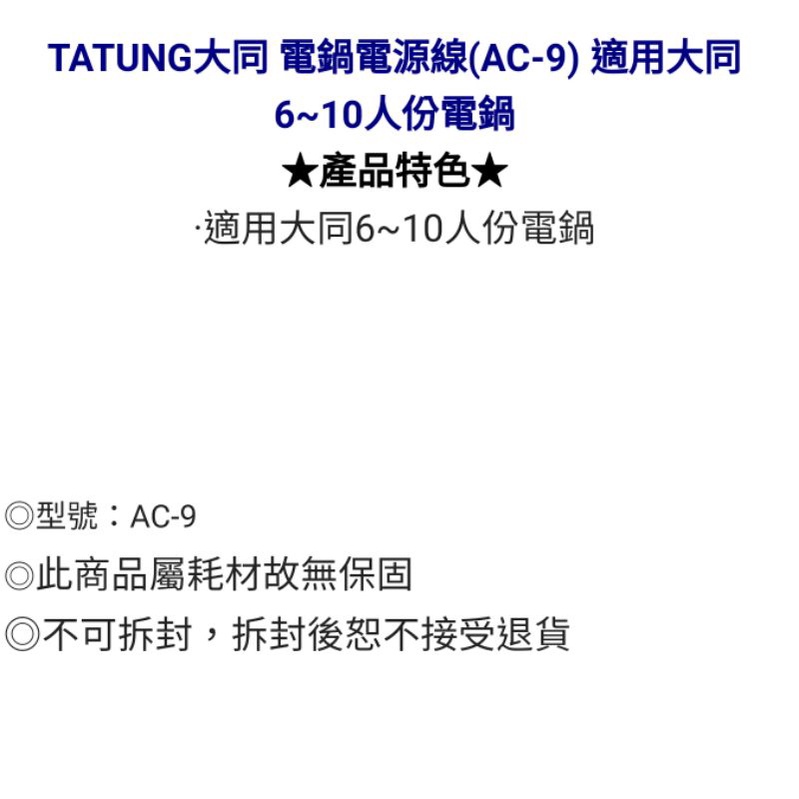 TATUNG大同電鍋 電源線(AC-9) 6/10/11人份電鍋線