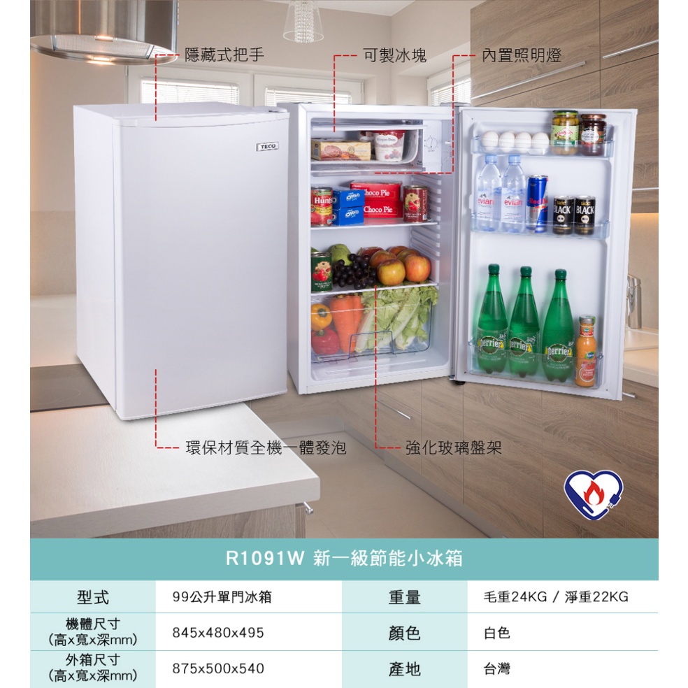 TECO東元 【小鮮綠】 99L定頻單門冰箱 R1091W 一級節能 (含拆箱定位+舊機回收) 小冰箱