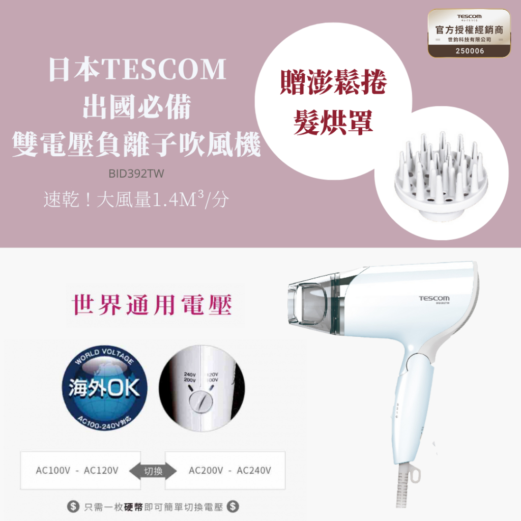TESCOM BID392TW BID392 雙電壓負離子吹風機 雙電壓 國際電壓 出國用 吹風機
