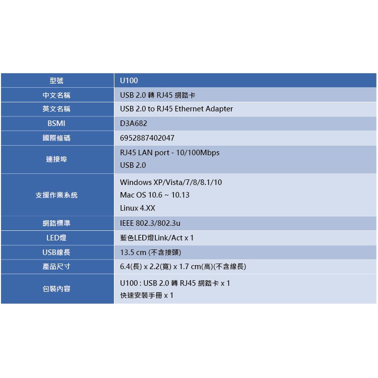 TOTOLINK U100 USB 網卡 USB轉RJ45 USB有線網路卡【支援WIN免驅動/Linux / MAC】