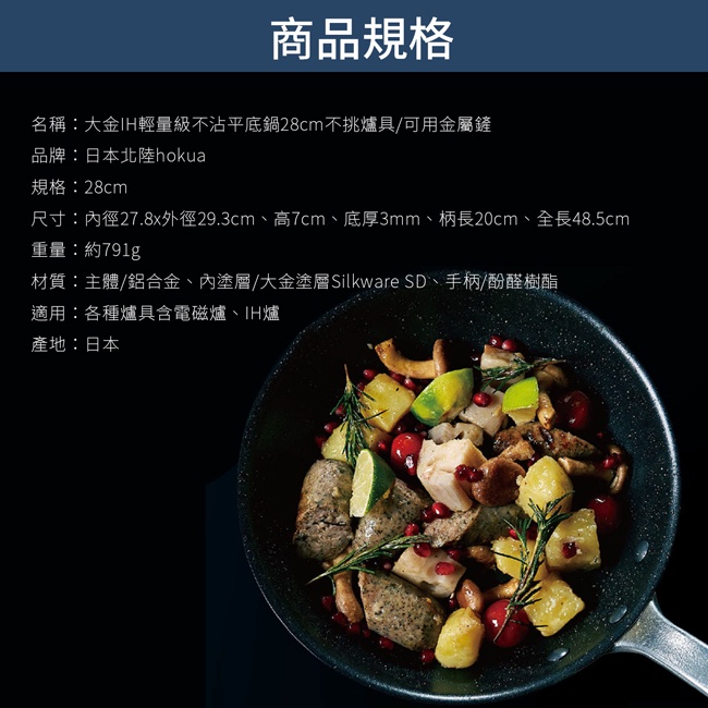 【日本北陸hokua】日本製大金IH輕量級不沾平底鍋28cm不挑爐具/可用金屬鏟