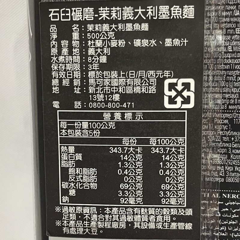 【億明食品】Molisana茉莉義大利麵|615號墨魚麵 500g|獨特墨魚風味|滑順柔韌口感