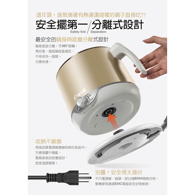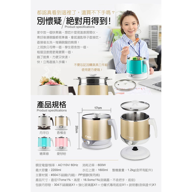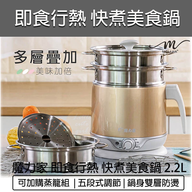 【公司貨】魔力家 304不鏽鋼雙層防燙隔熱美食鍋 快煮鍋 2.2L 蒸/煮/涮 電子鍋 快煮壺 泡麵碗 電火鍋