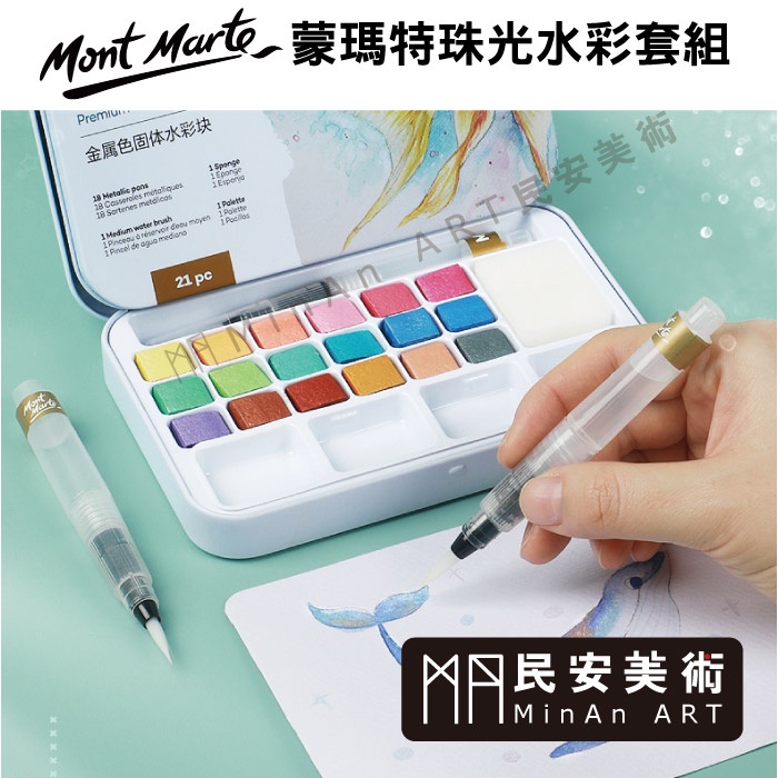 ★民安美術 澳洲 Mont Marte 蒙瑪特 蒙馬特 金屬色 珠光色 塊狀水彩 18色套組 含水筆 @650m