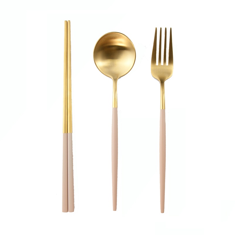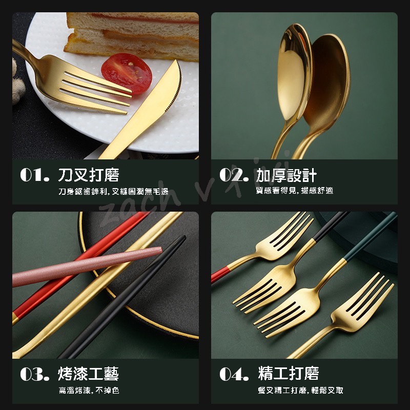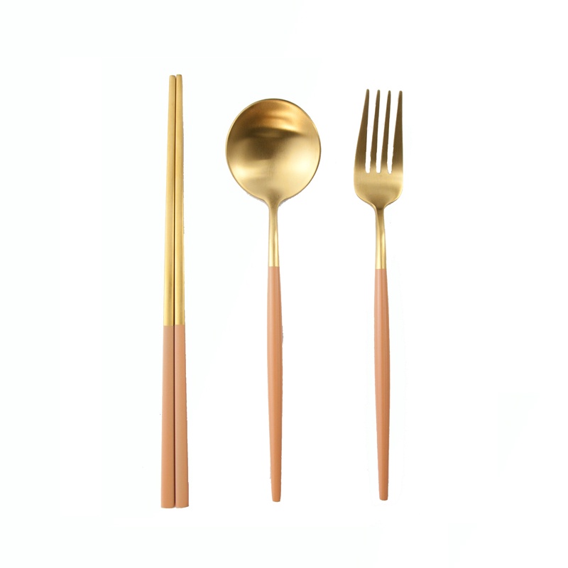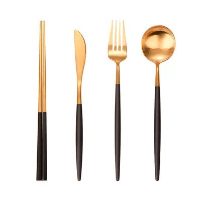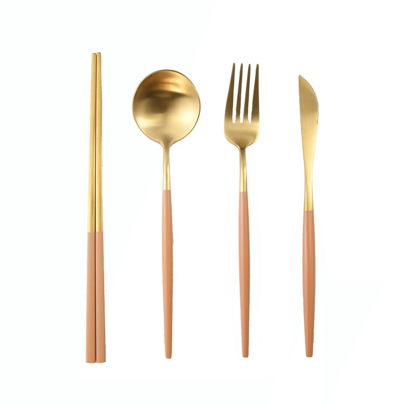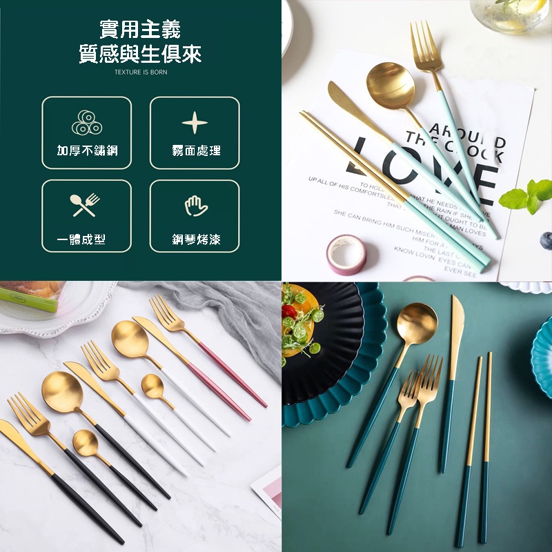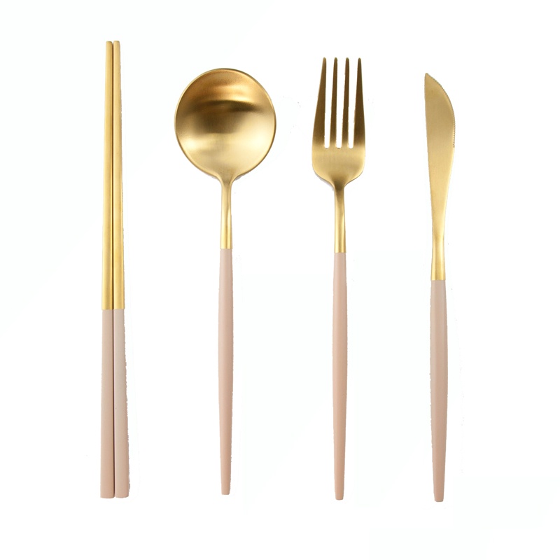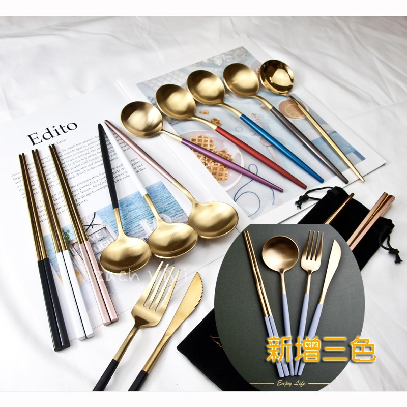 【加厚款四件組】北歐 葡萄牙 304不鏽鋼 餐具 湯匙 筷子 刀叉 金色 玫瑰金 奶茶色 環保 叉子 環保餐具 旅行餐具