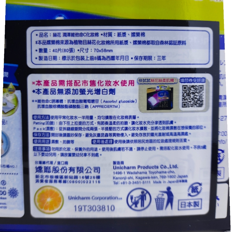 《台灣公司貨》絲花 1/2化妝棉 潤澤維他命C化妝棉 40片 盒