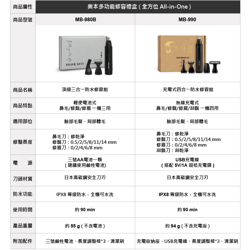 URBANER奧本【防水三合一修容禮盒組】 MB-980B 鼻毛刀 修鬍刀 修眉 奧本電剪 情人節禮物 台灣製造