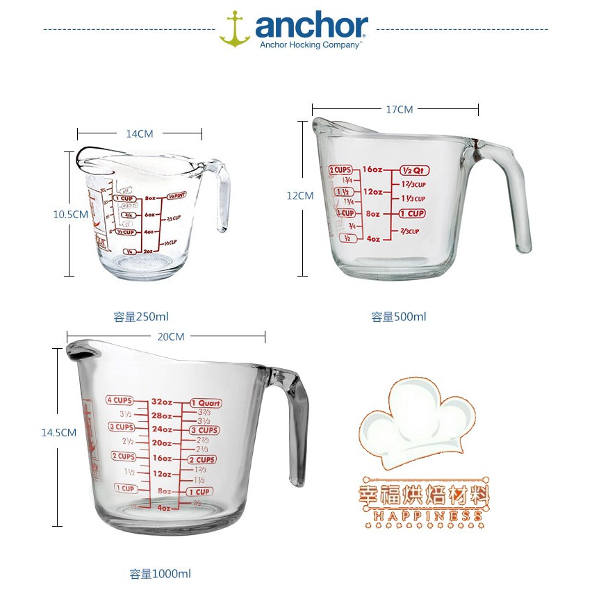 【幸福烘焙材料】美國製 anchor 安佳強化玻璃量杯 耐熱玻璃 可微波 量杯 烤箱 (三種刻度)
