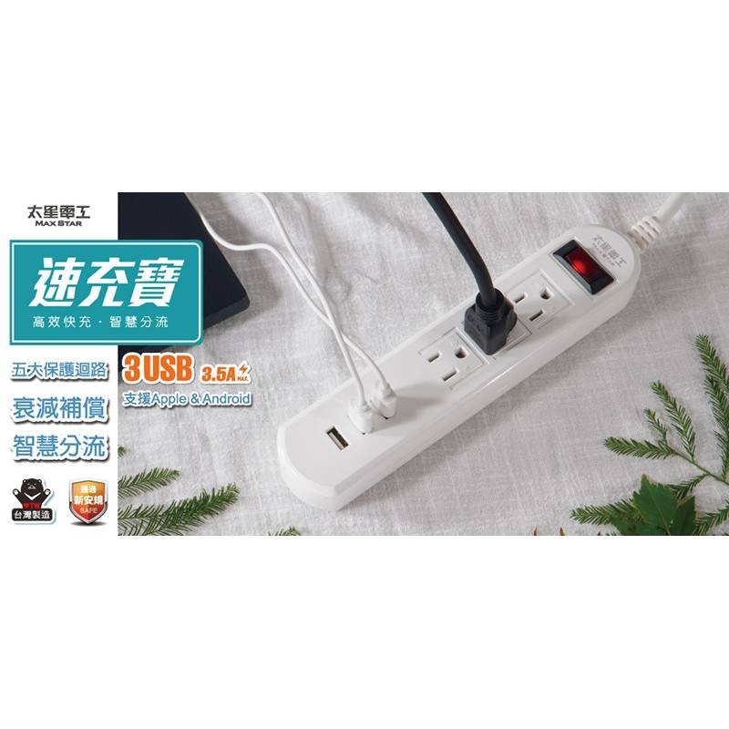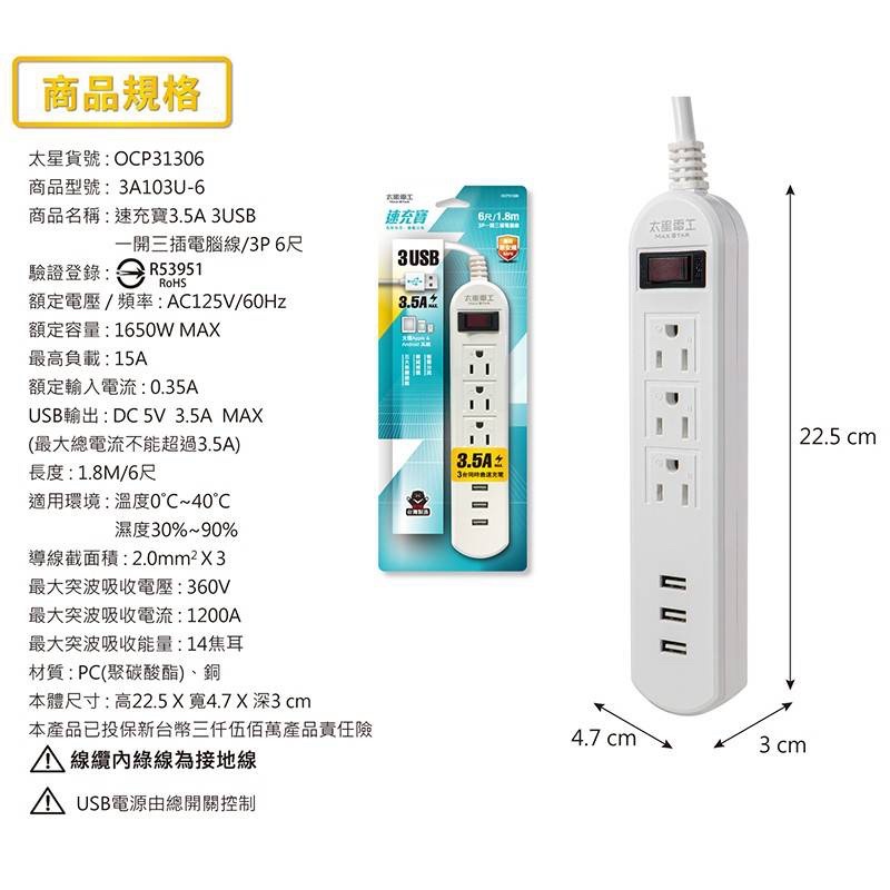 【太星電工】速充寶3.5A 3USB一開三插電腦線/3P(4尺6尺) OCP3130406台灣製造