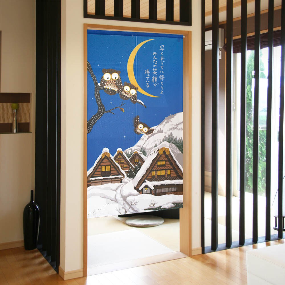 Vintage+。復古家。日本製和風系列。冬季合掌村貓頭鷹滿版印花整片式風水簾中間分開長門簾(85*150cm)(特價)