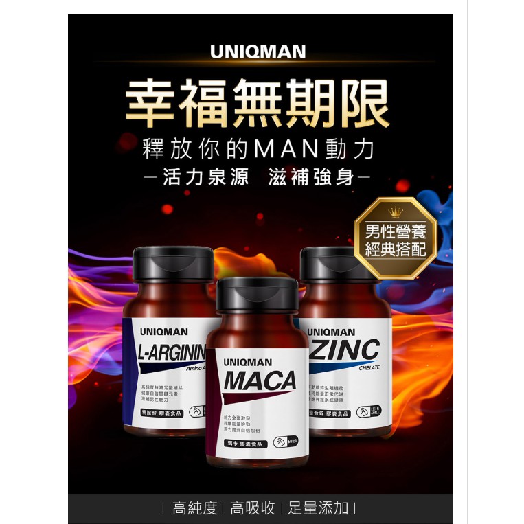 UNIQMAN 戰力持續組 瑪卡(60粒/瓶)/螯合鋅(60粒/瓶)/精胺酸(60粒/瓶)