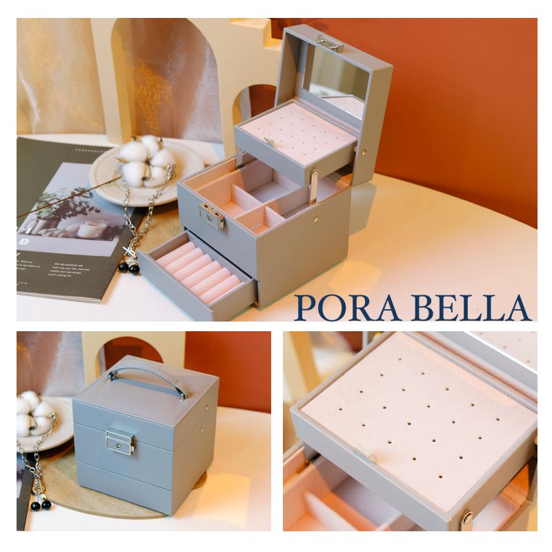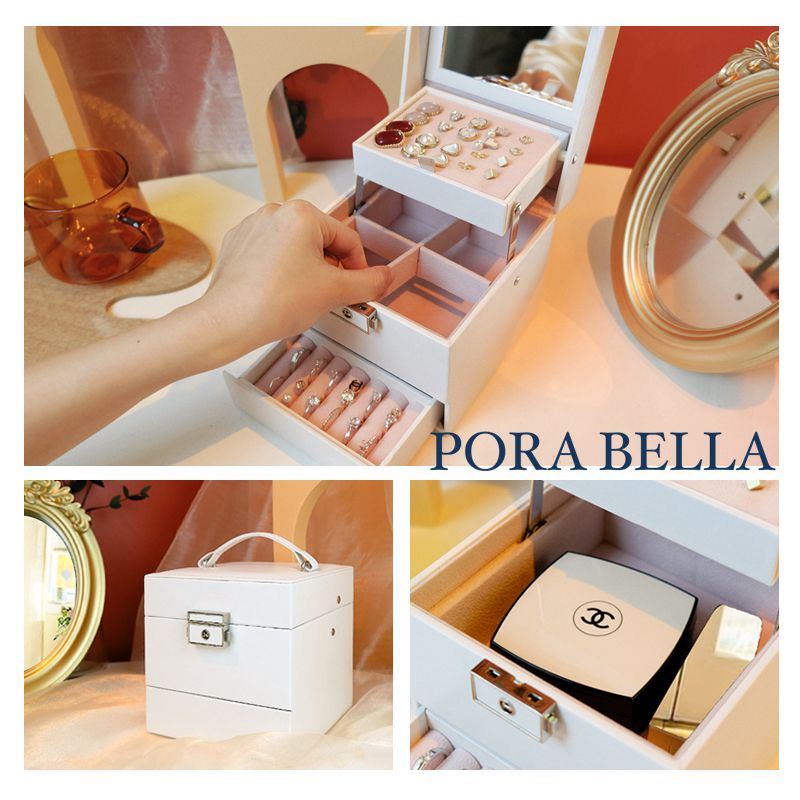<Porabella>手提鏡子皮革首飾盒 手提珠寶盒旅行旅遊 絨布盒飾品盒 飾品戒指項鍊耳環耳夾收納 生日禮物 送女友