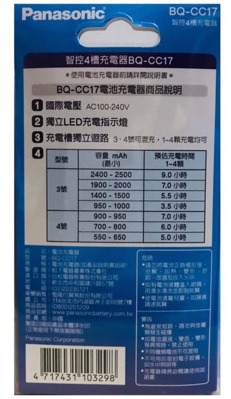Panasonic eneloop 智控型4槽 鎳氫低自放充電器 BQ-CC17 國際牌台灣公司貨 可同時充三號四號