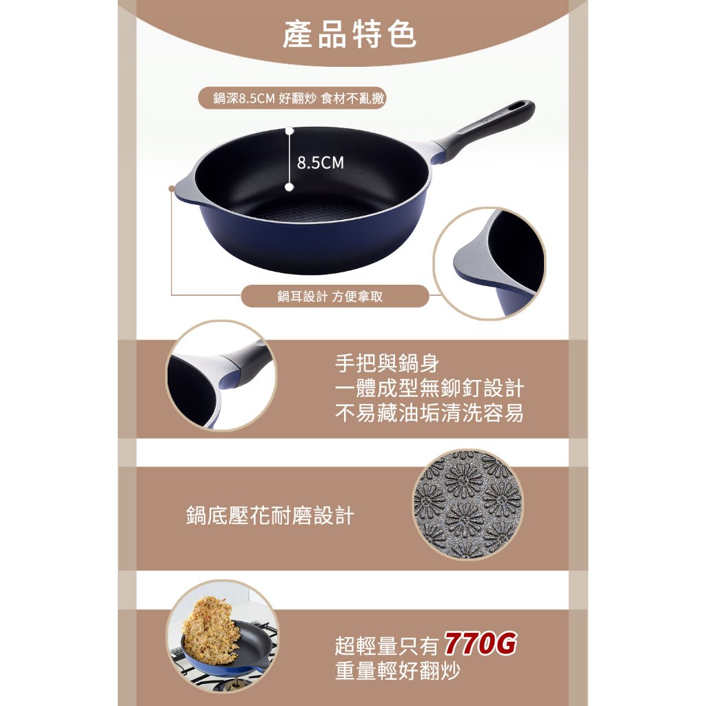 免卷免運 Arnest Bellfina 28cm 瓦斯用高導熱不沾炒鍋 鍋深8.5cm 輕量不沾鍋