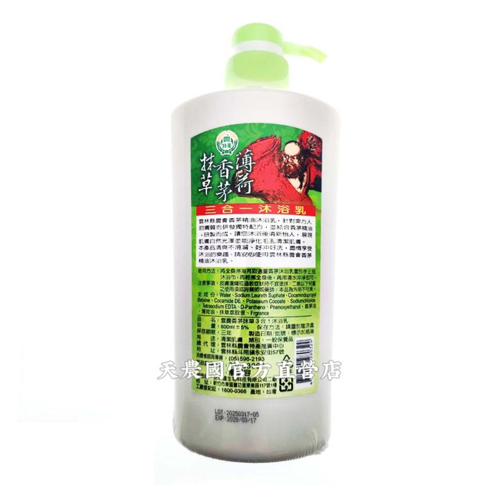 [天農國-雲林農會]雲林縣農會抹草香茅薄荷三合一沐浴乳600ml*1瓶~有效期至2028/3月-202803K3M24