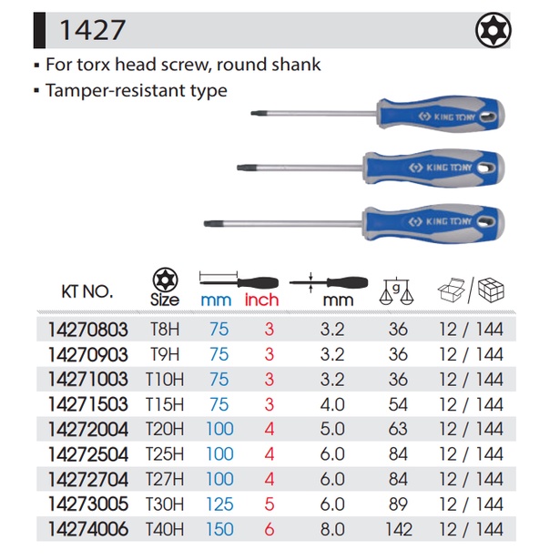 [士東工具]King Tony 膠柄星型中孔起子 六角星型中孔起子 螺絲起子 星型起子 六角起子 手動起子 1427