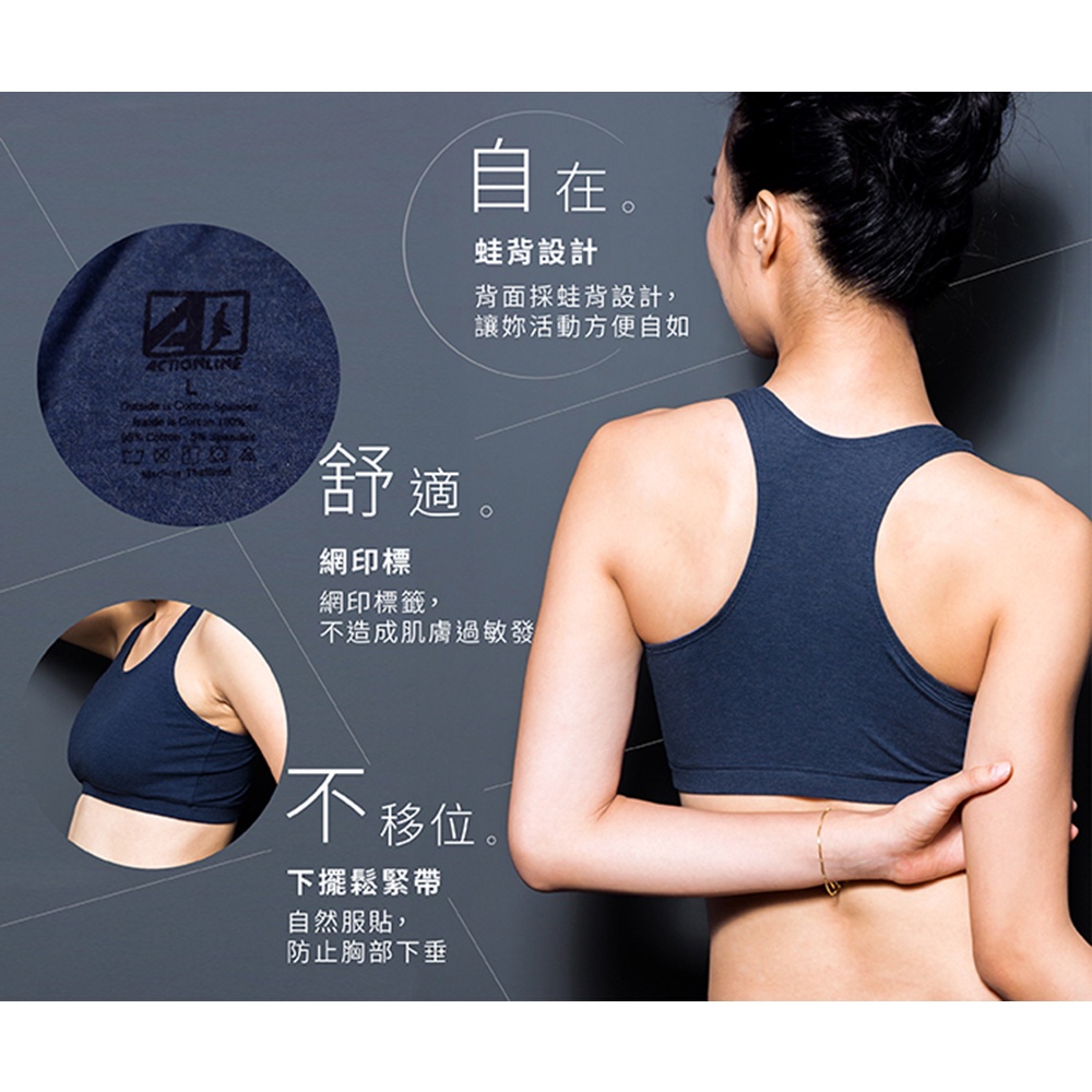 【ACTIONLINE】純棉運動內衣(附胸墊)-黑色/灰色/藍色-3色