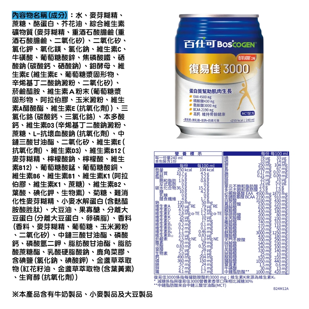 <免運+會員蝦幣10%+5%>百仕可 復易佳3000營養素(香草減糖)x24罐 (關鍵蛋白質 金盞草萃取物 ) 專品藥局