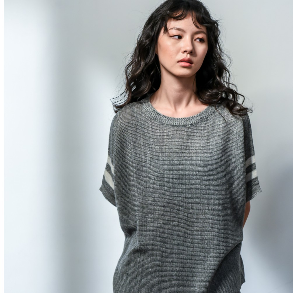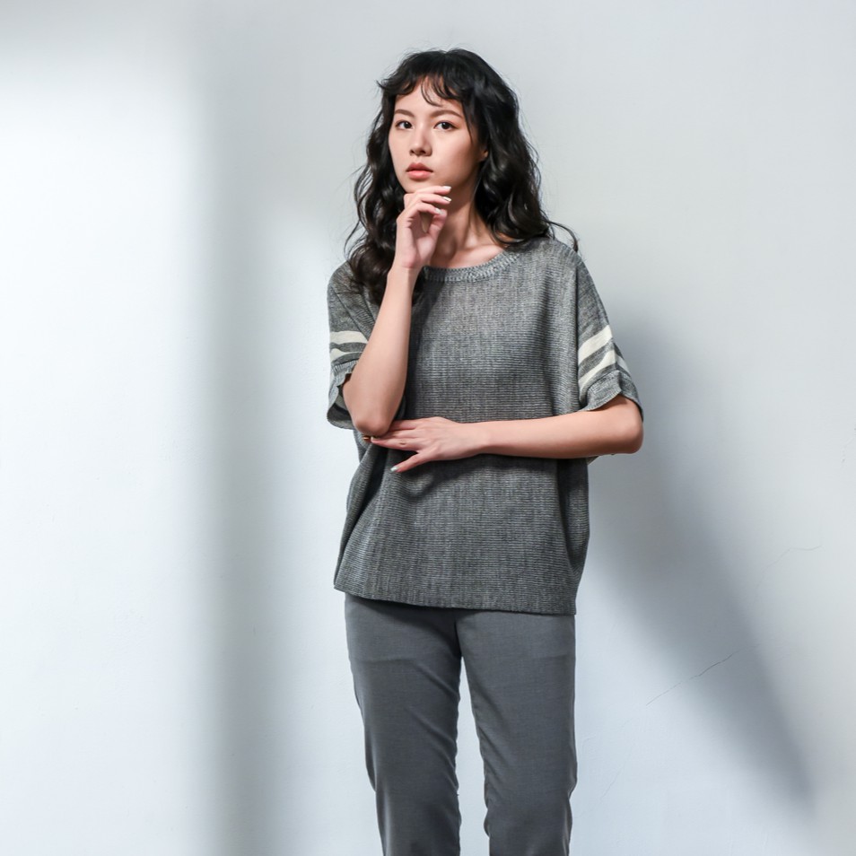O-LIWAY 淺灰色 台灣製 MIT 俐落感混色連袖配條針織短袖上衣-oliway