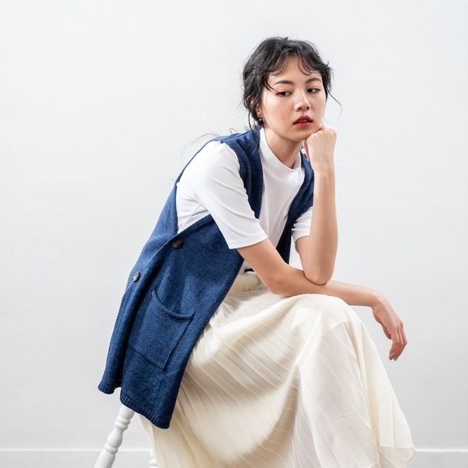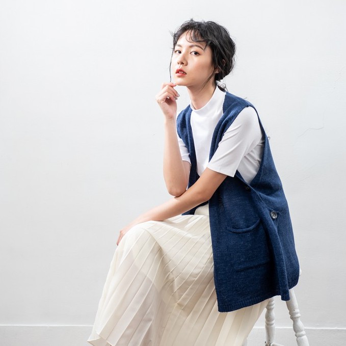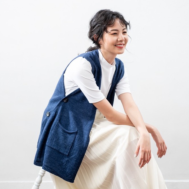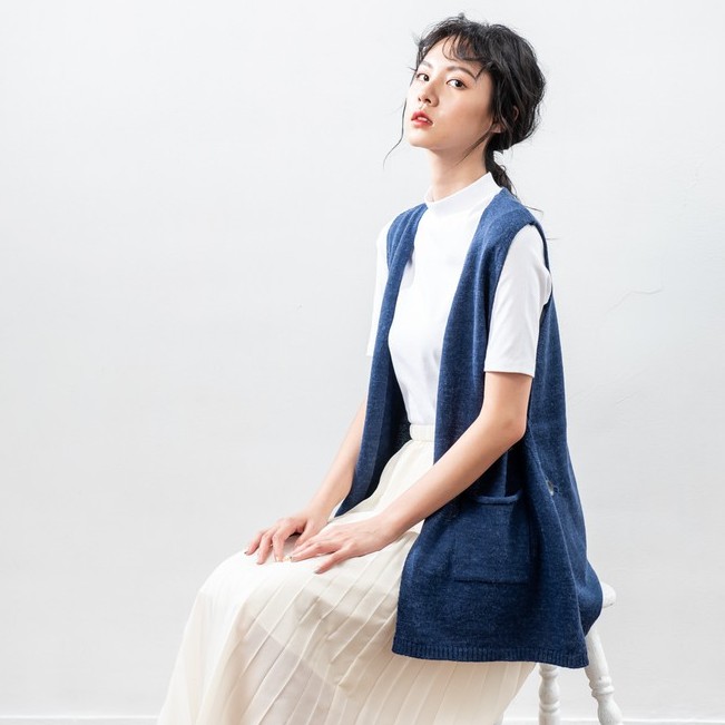 O-LIWAY 牛仔藍 台灣製MIT 設計款V領四釦長版開襟針織背心針織外套-oliway