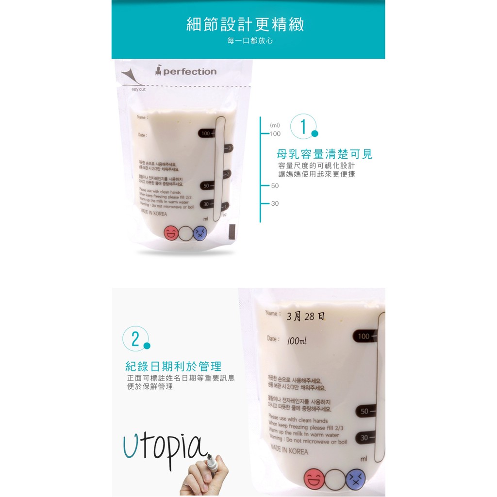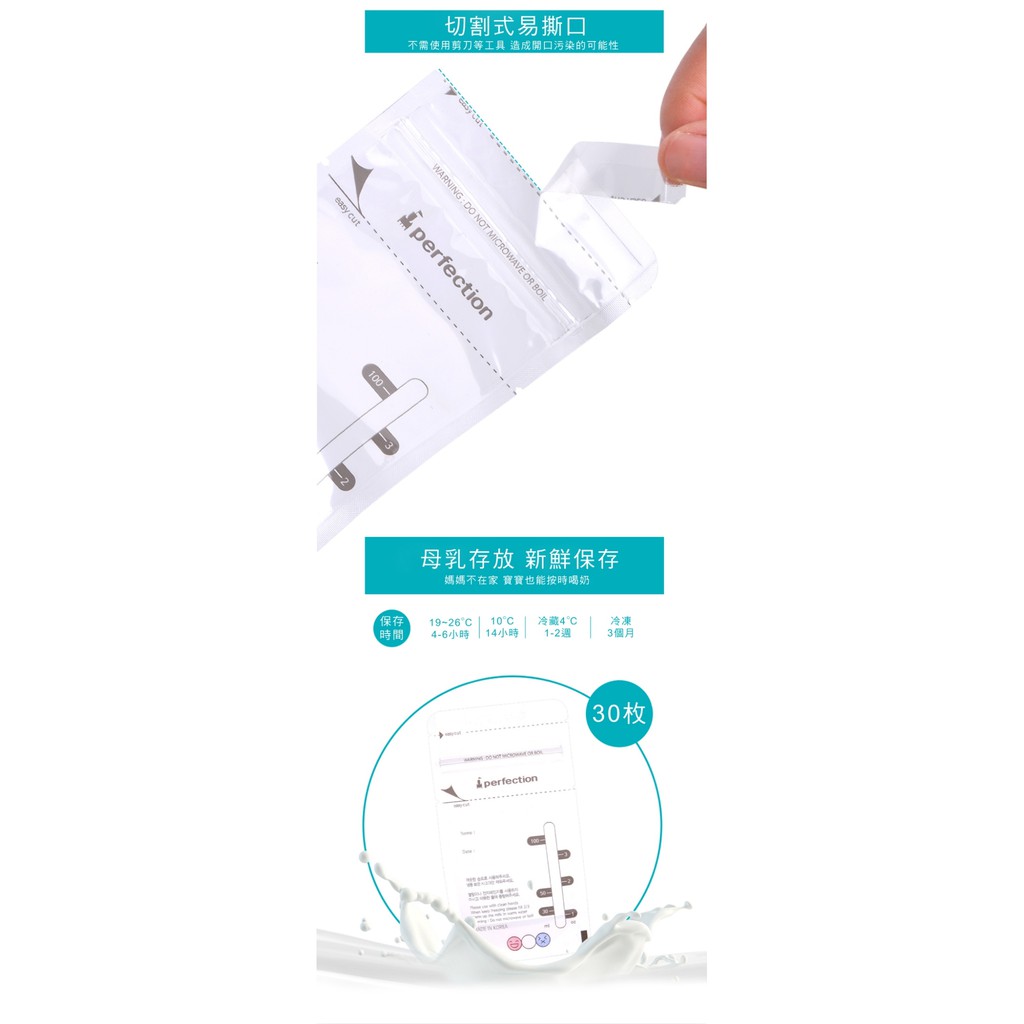 韓國【perfection】100ml辨溫母乳冷凍袋(30入)【傳佳知寶】(母奶袋 集乳袋 儲奶袋 直立式 初乳專用)