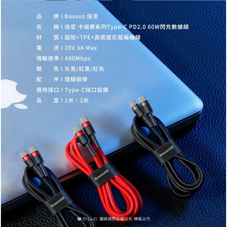 【Baseus倍思】卡福樂 Type-C to Type-C 傳輸線 充電線PD2.0閃充 60W/100W 蘋果15