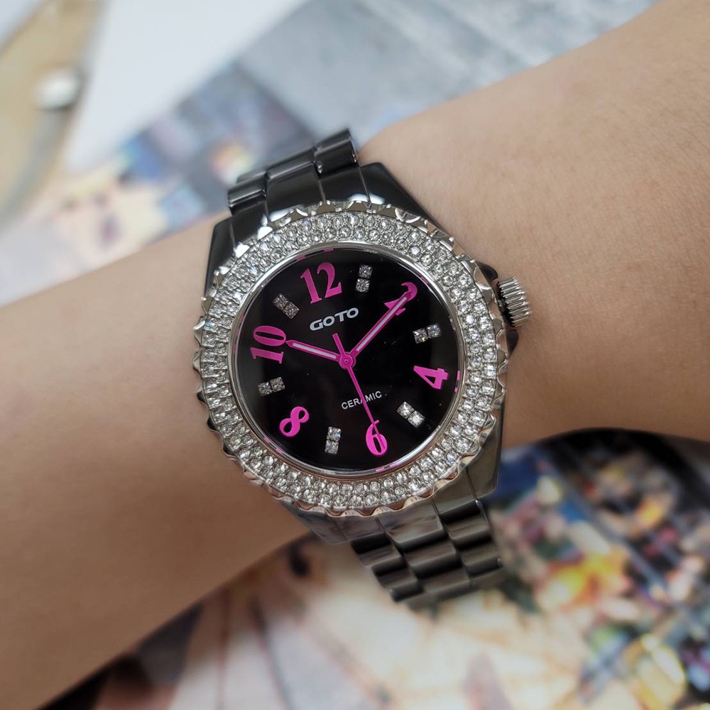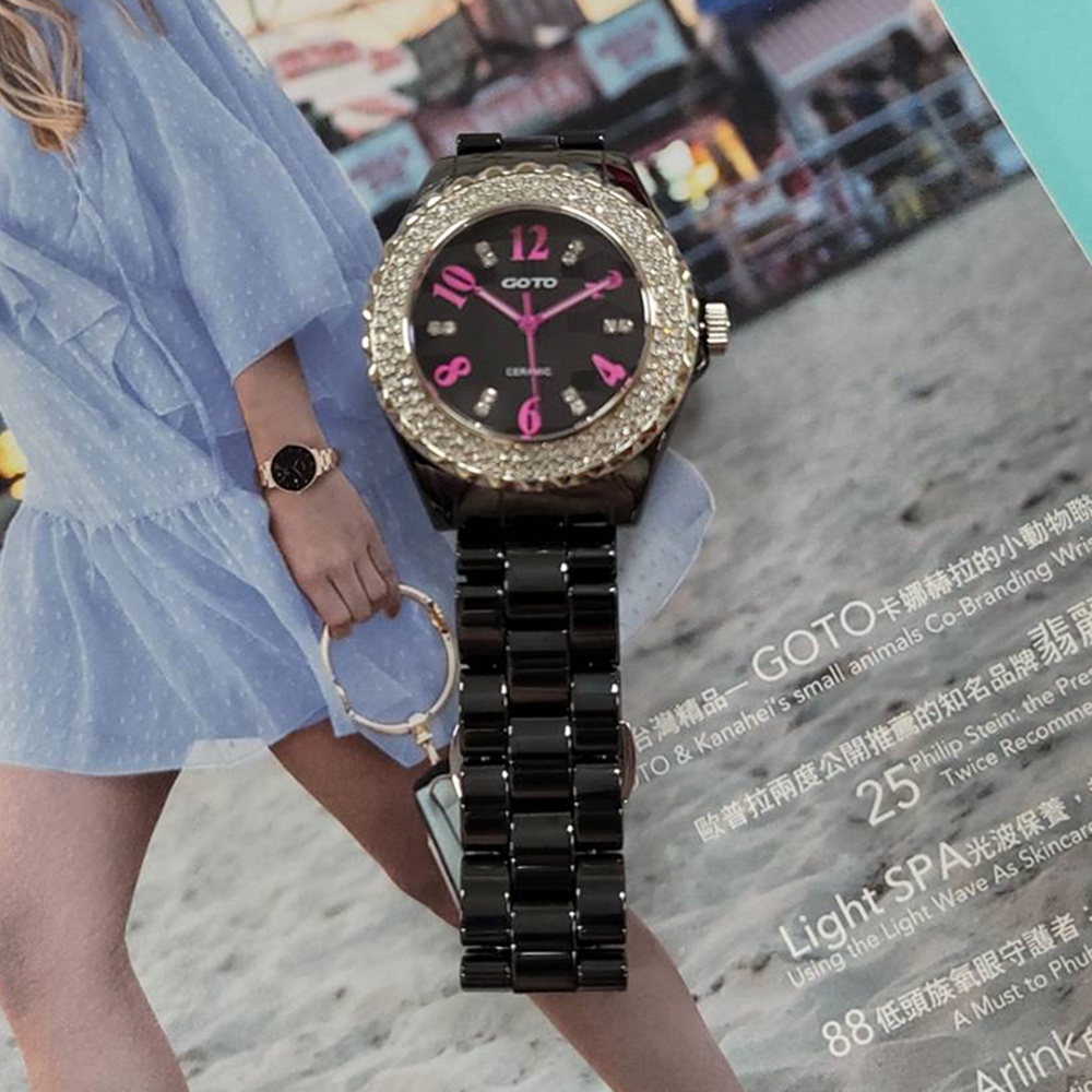 GOTO 雙排晶鑽奢華時尚精密陶瓷手錶-黑x桃
