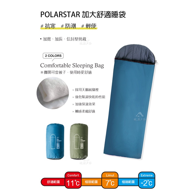 【PolarStar】加大舒適睡袋 P21720 藍綠/軍綠 2色