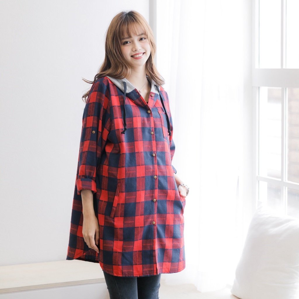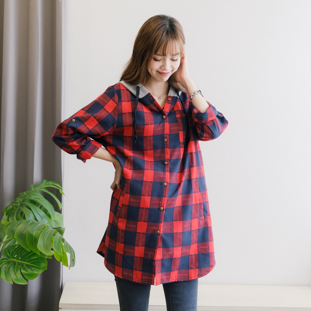 Mamamia孕婦裝 磨毛格紋連帽長版哺乳衣 正韓製 襯衫 哺乳襯衫 孕婦裝 哺乳上衣 長袖 長版上衣 [A1346]