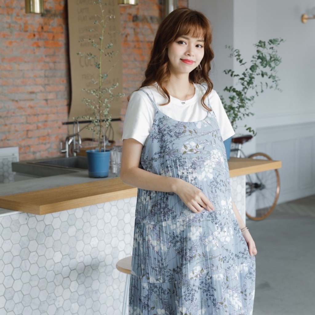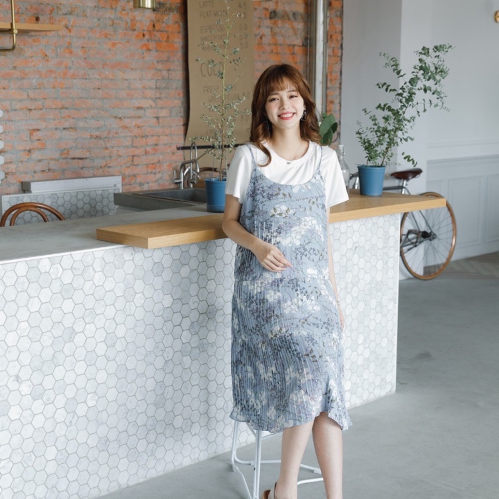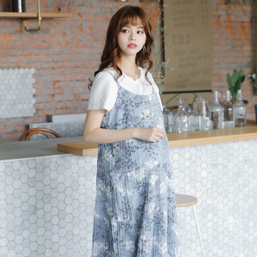 Mamamia孕婦裝 兩件式哺乳T+碎花雪紡吊帶哺乳洋裝 孕婦裝 孕婦裙 孕婦洋裝 喂奶衣 短袖[A1269]