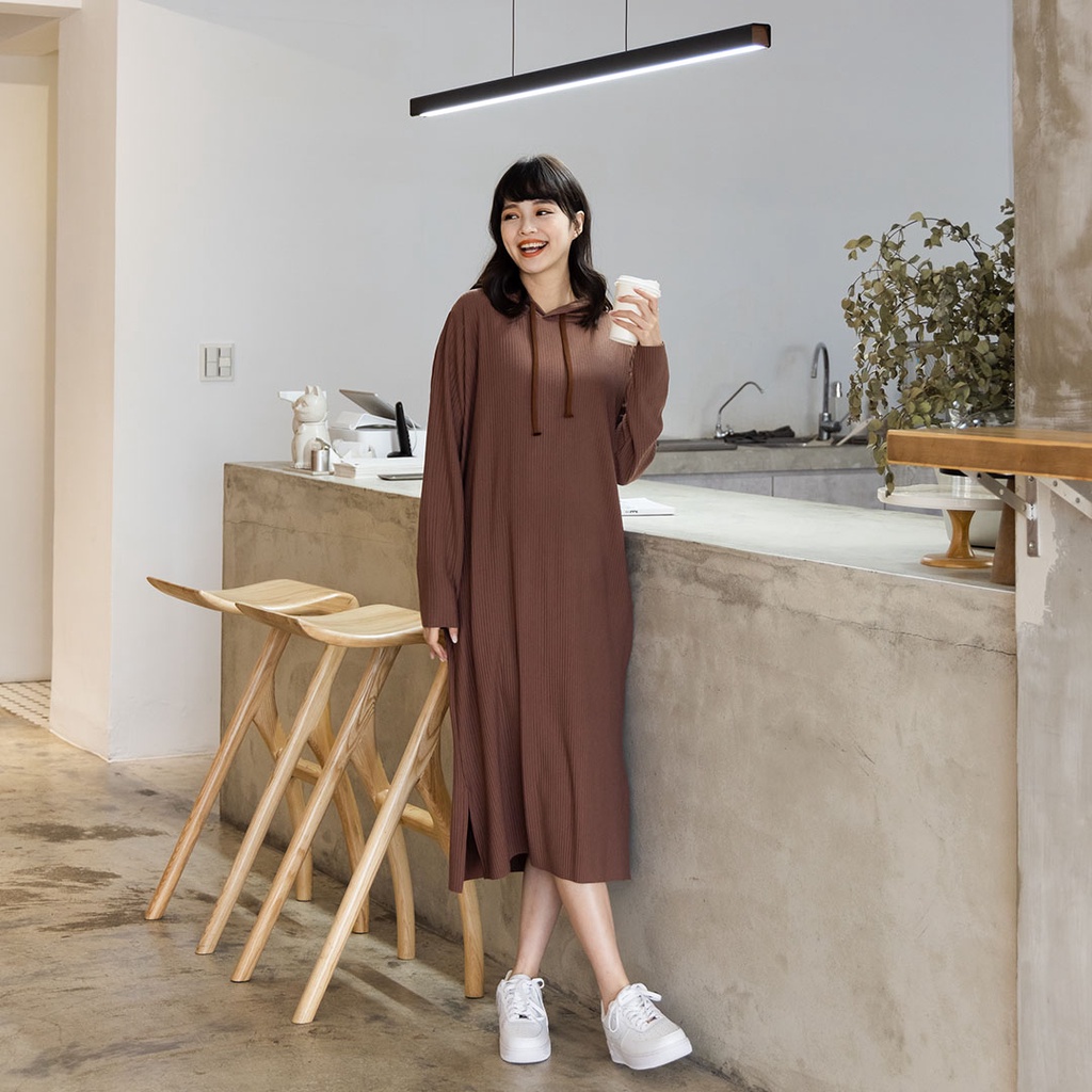 Mamamia孕婦裝 坑條顯瘦連帽洋裝 正韓製 連帽洋裝 長袖 孕婦連身裙 孕婦洋裝 [D7235]