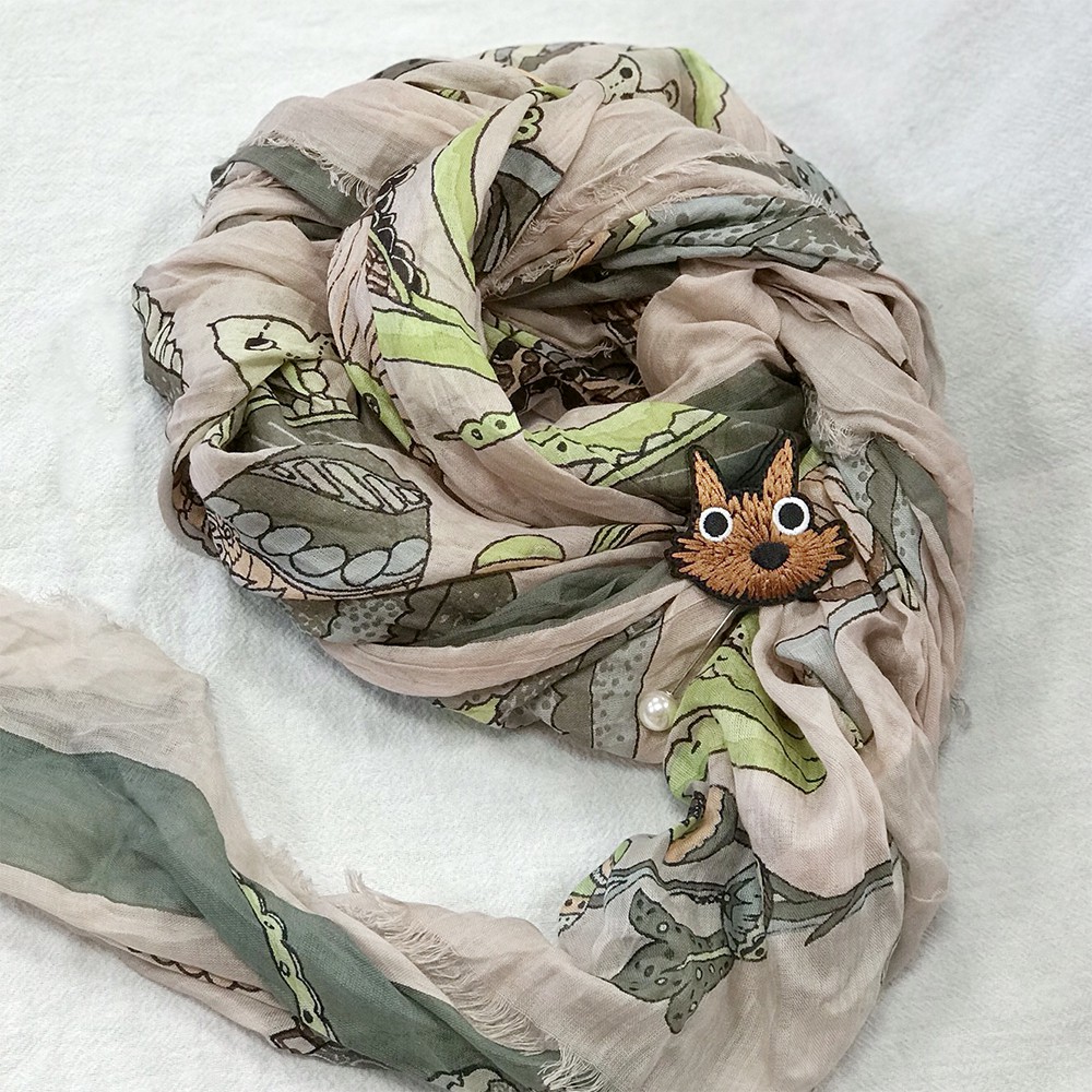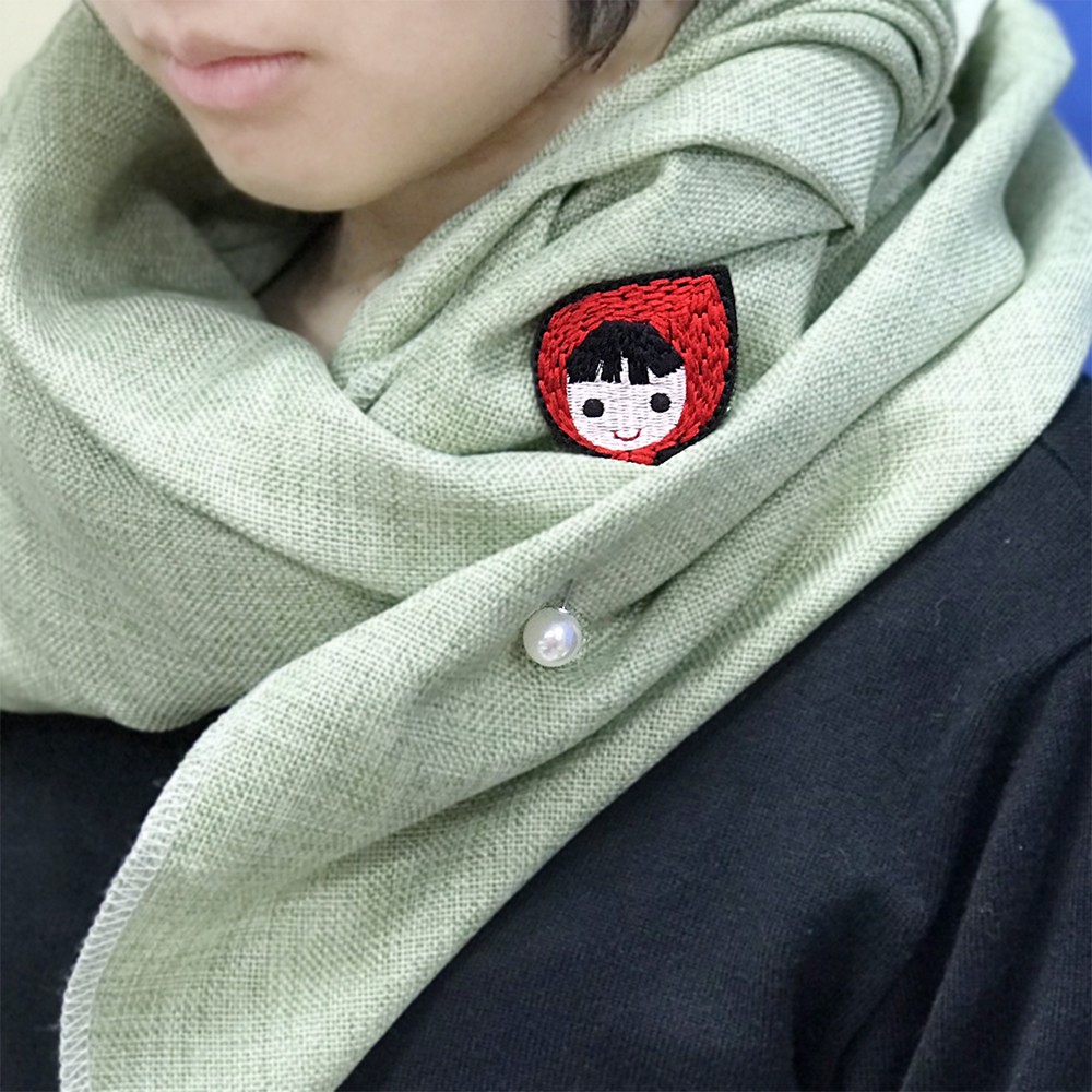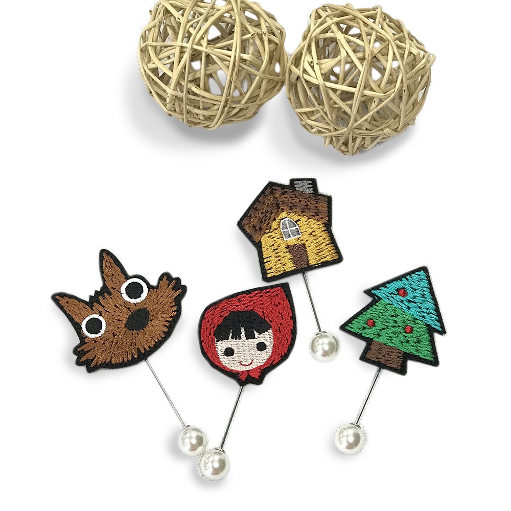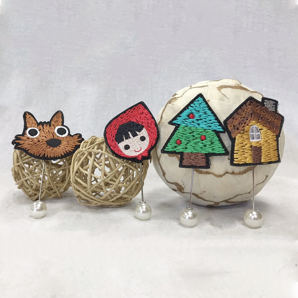 手工刺繡長尾珍珠別針/胸針 - 小紅帽大野狼小木屋可愛樹