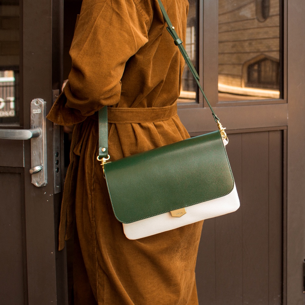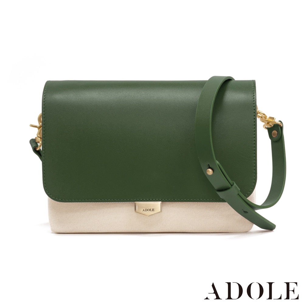 【ADOLE】真皮袋蓋三層帆布包米色(綠)│Aday真皮組合 可放長夾 客製刻印