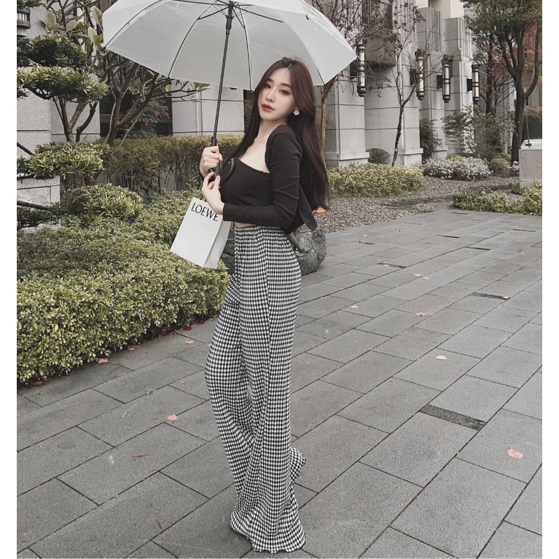 DOMISS自訂-時髦格喇叭長褲 格紋長褲 喇叭褲 (現貨)