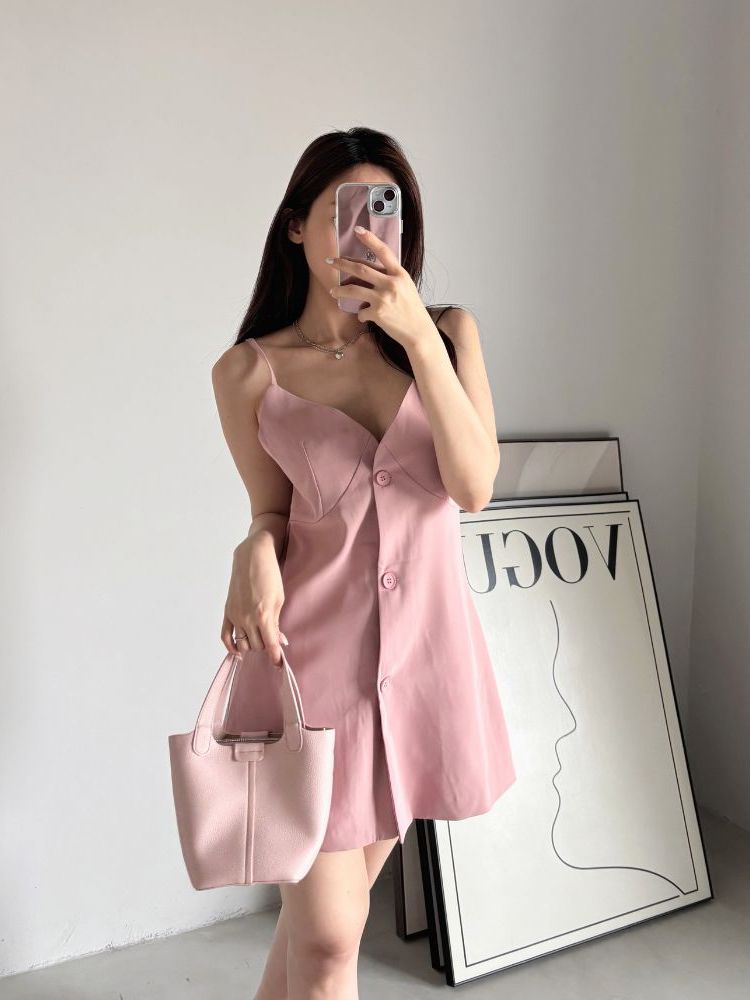 【糖霜蜜桃】V領細肩洋裝 微性感單排扣設計裙子(現貨)