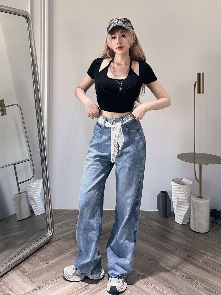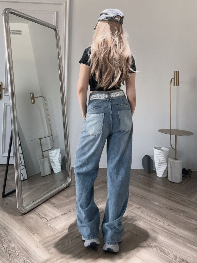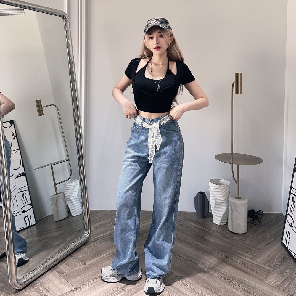 【DOMISS自訂】顯瘦刺繡牛仔長褲-附腰帶 牛仔褲 (現貨)