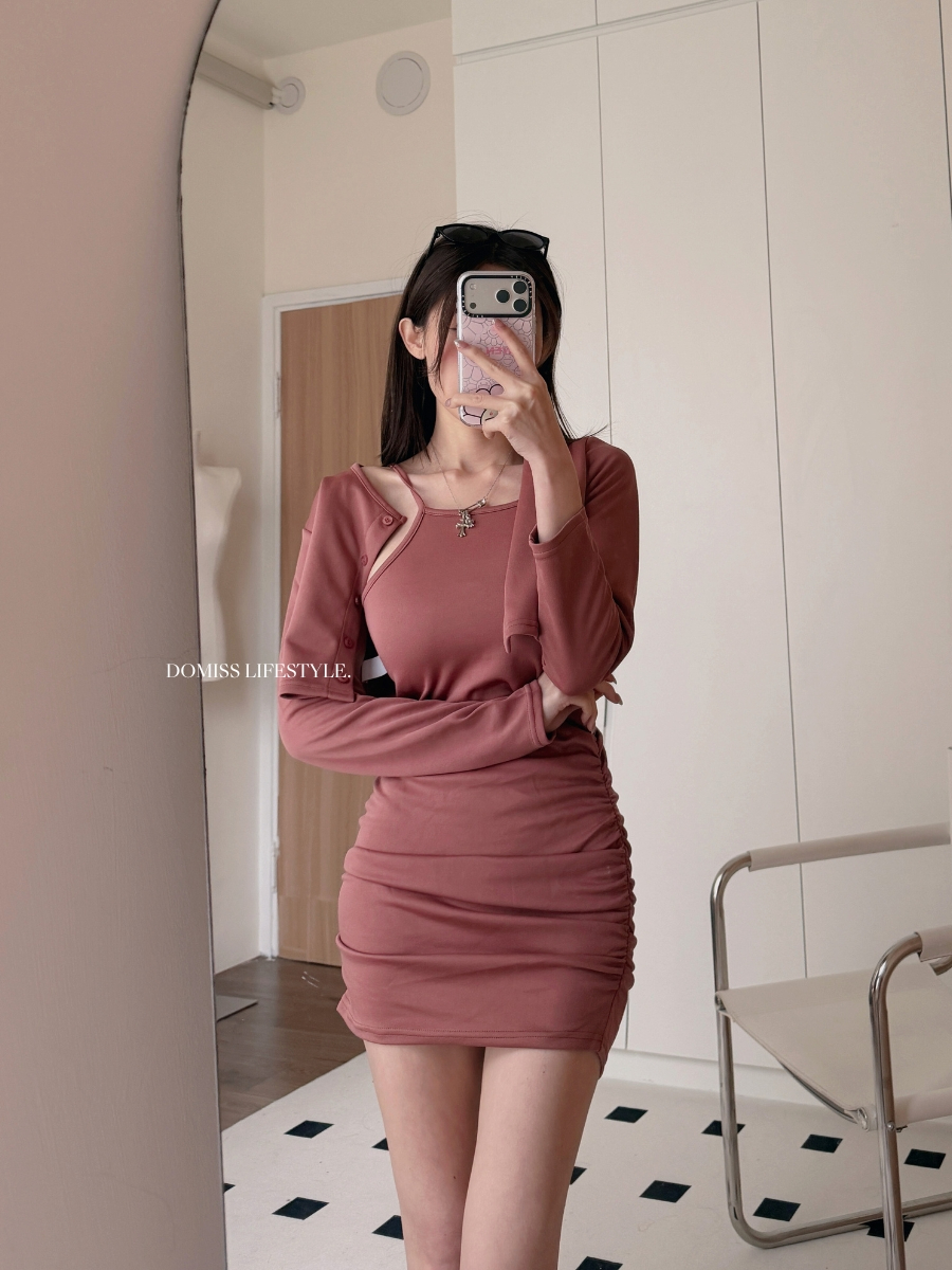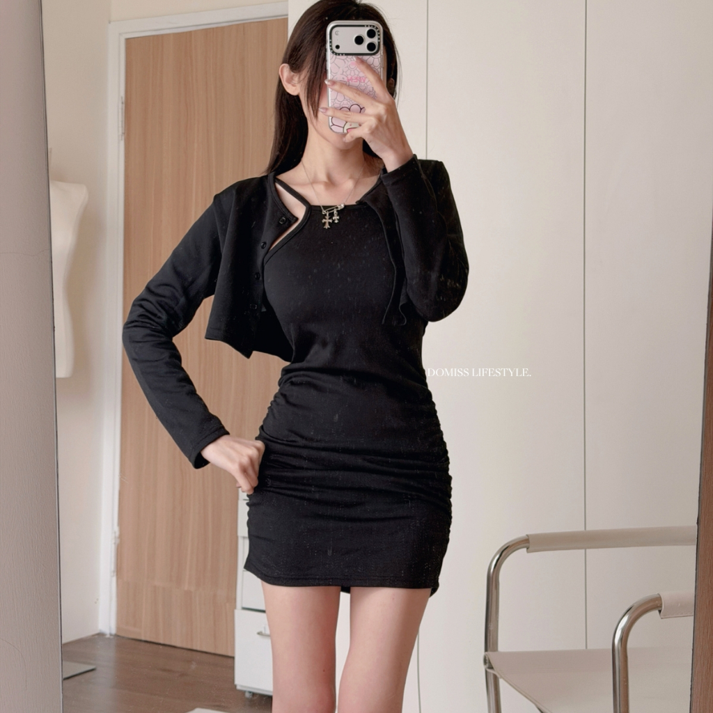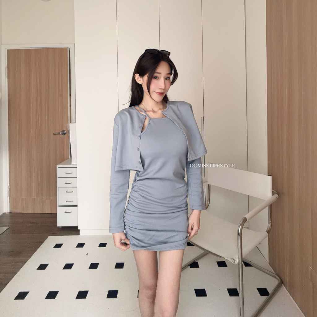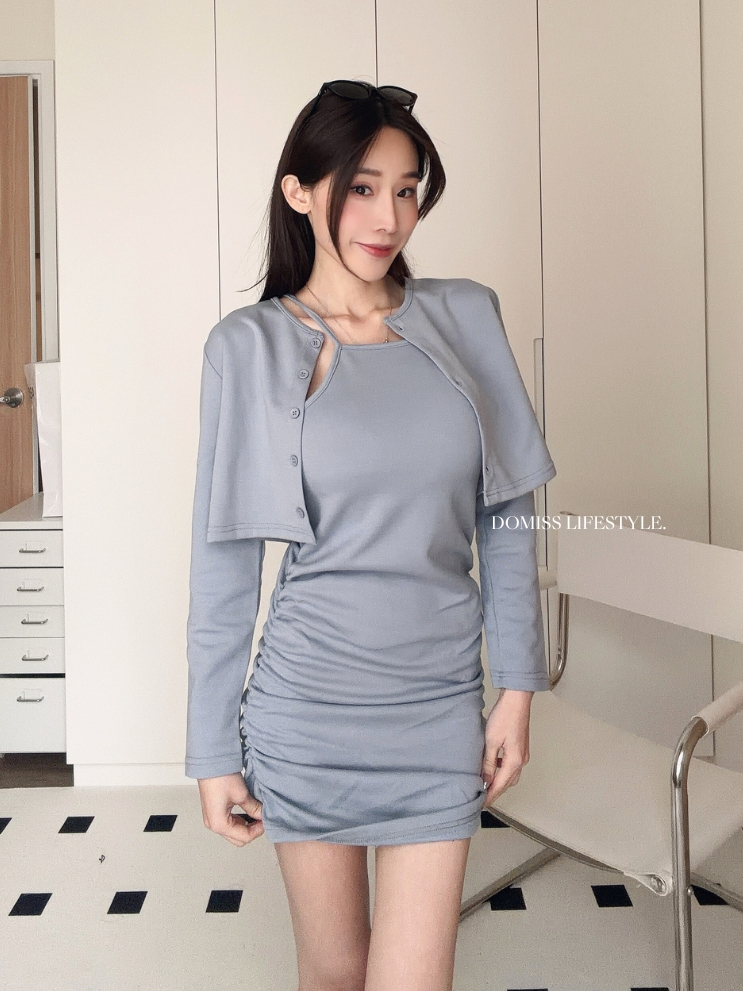 【甜辣洋裝】DOMISS自訂-抓皺洋裝+排釦外套 兩件套 套裝 (現貨)