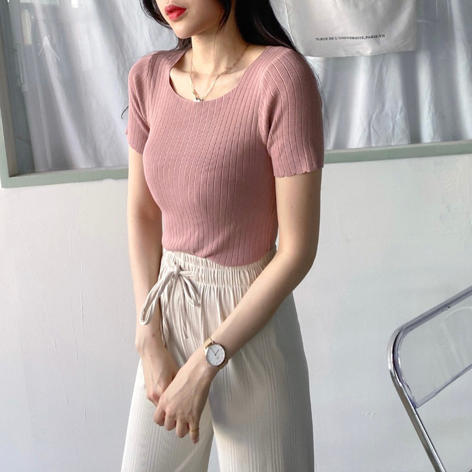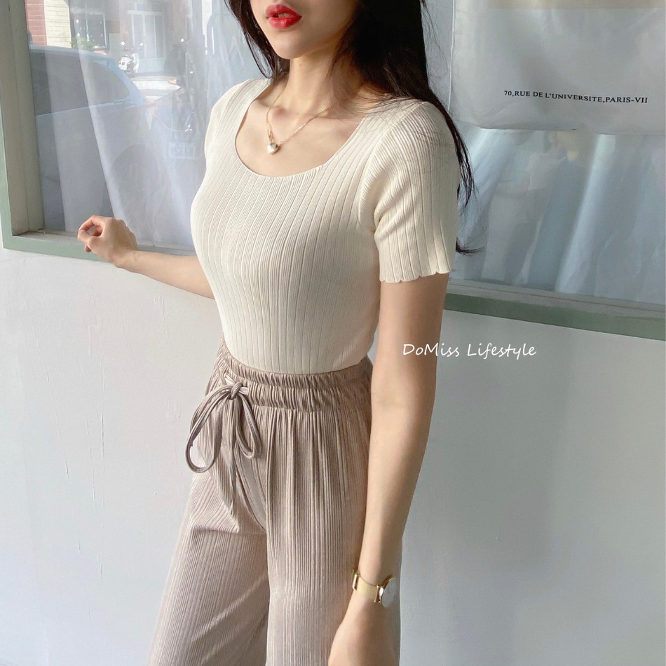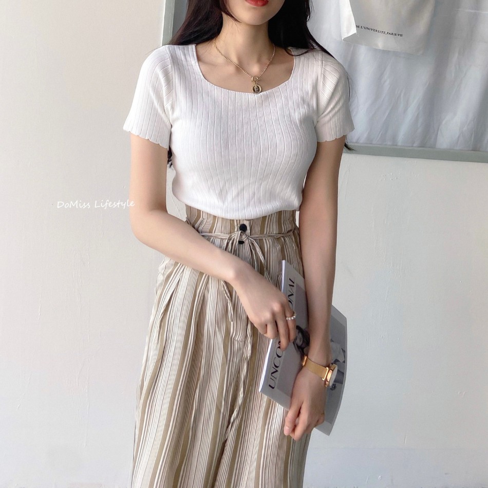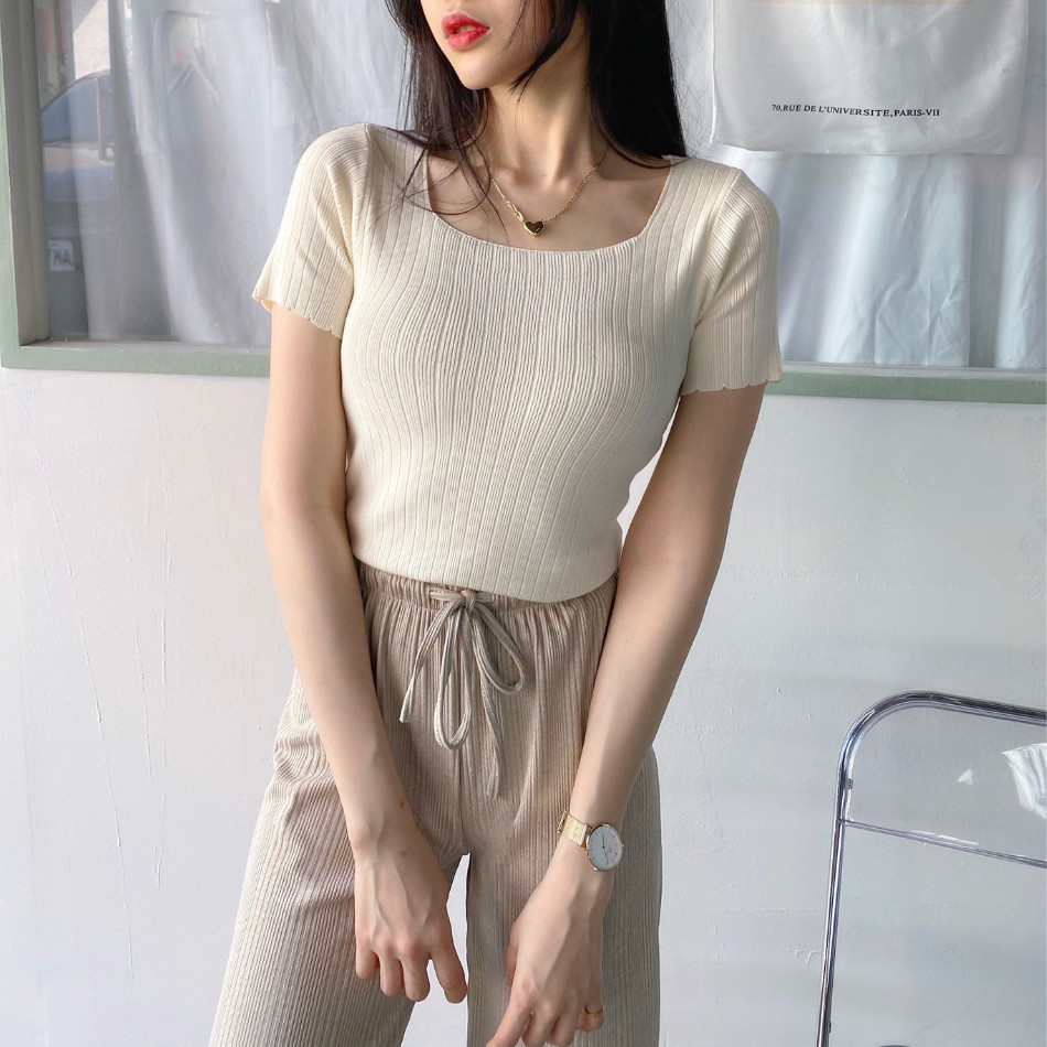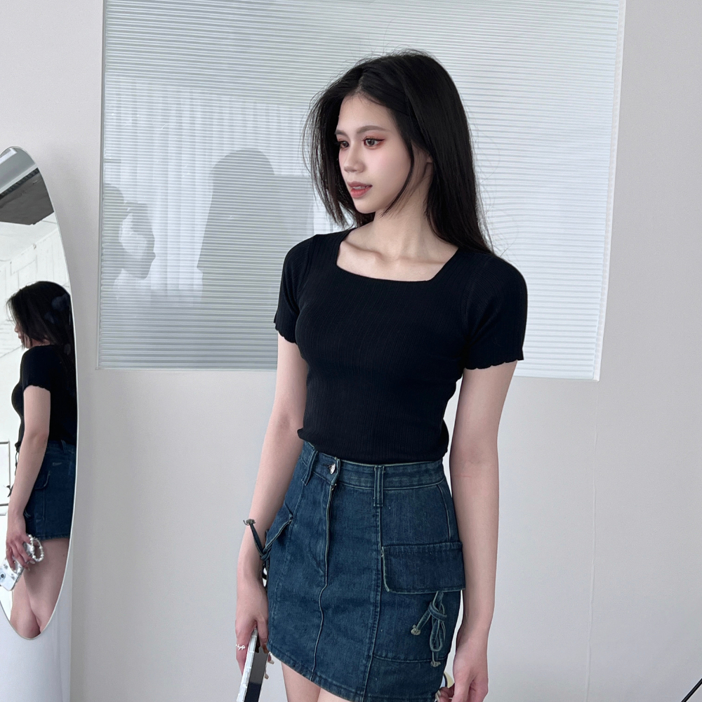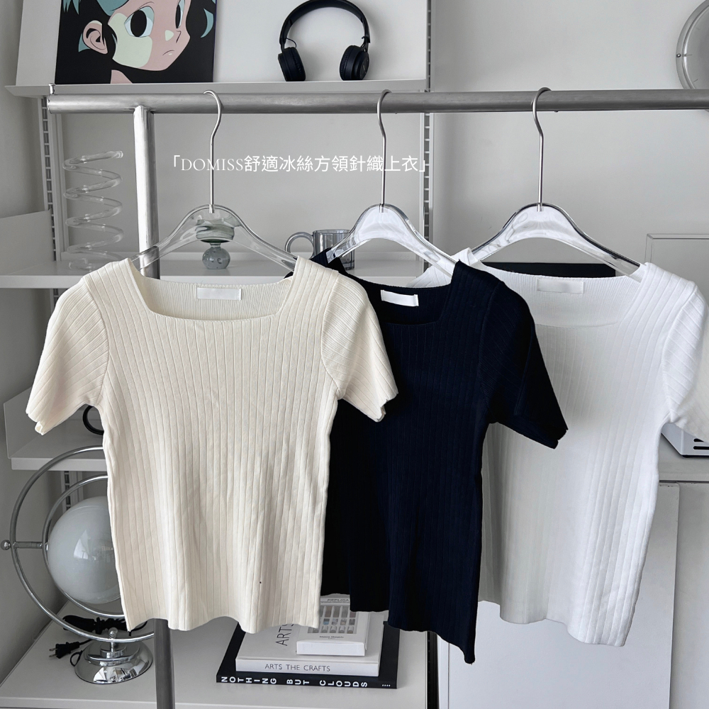 DOMISS實拍-舒適百搭! 顯瘦方領冰絲針織上衣 薄上衣 (現貨)