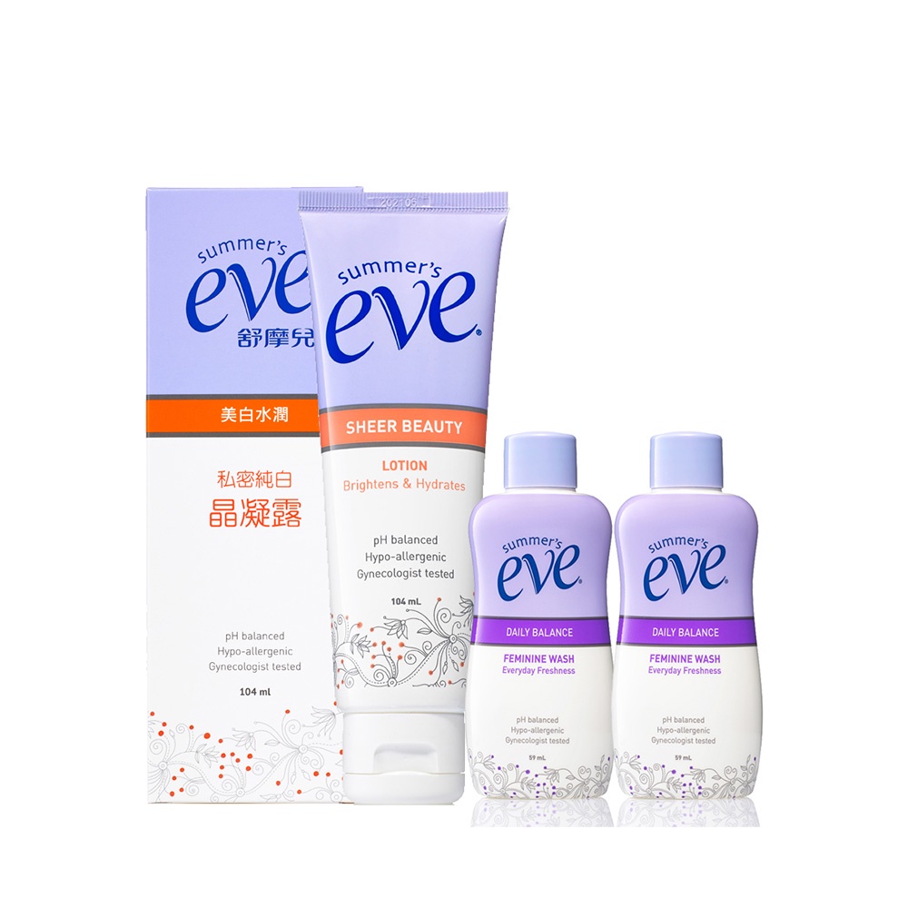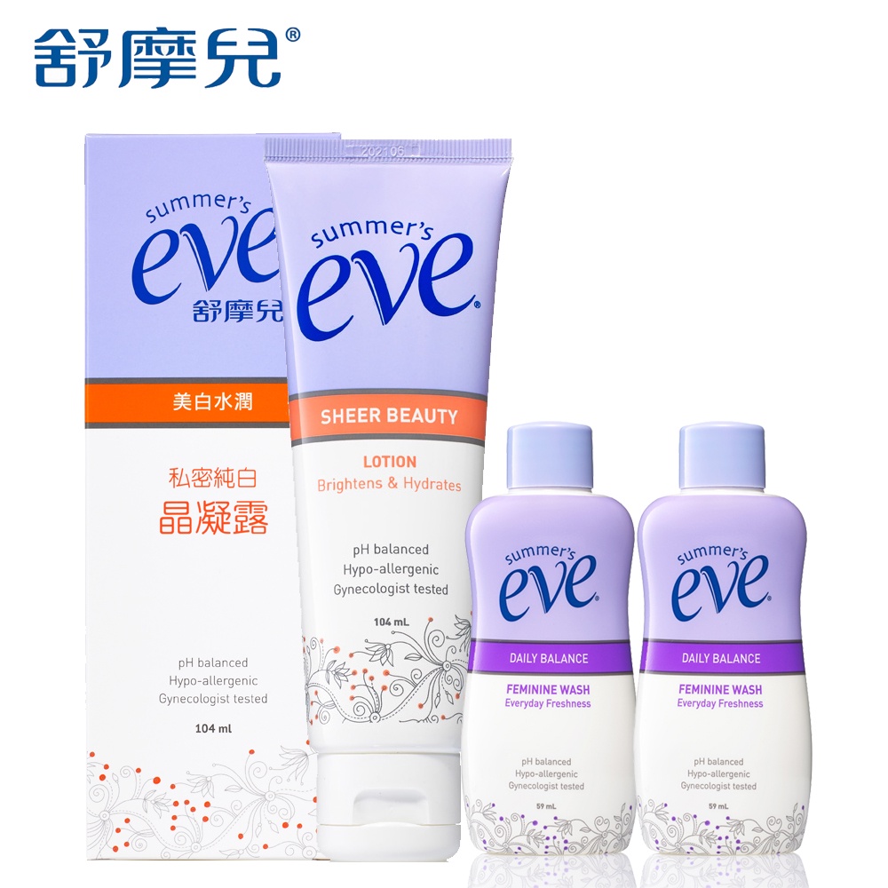 eve舒摩兒私密保養入門組(純白晶凝露104ml+甜美香氛浴潔露59mlx2)效期請詳見商品內容說明