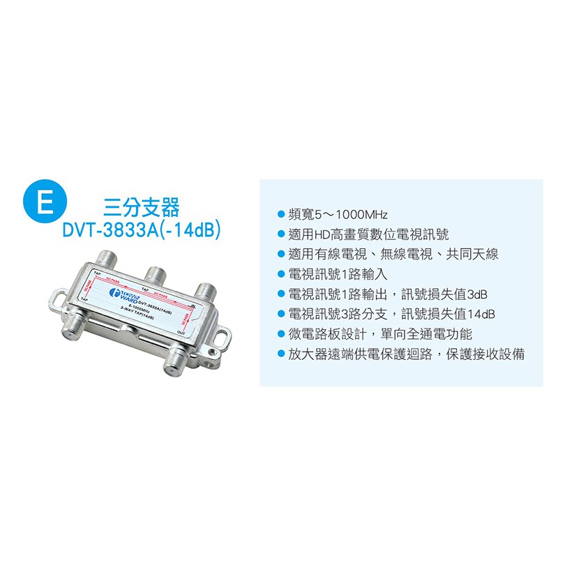 大城科技 電視三分支器 DVT-3833A-14dB 分支器 分歧器 保護迴路