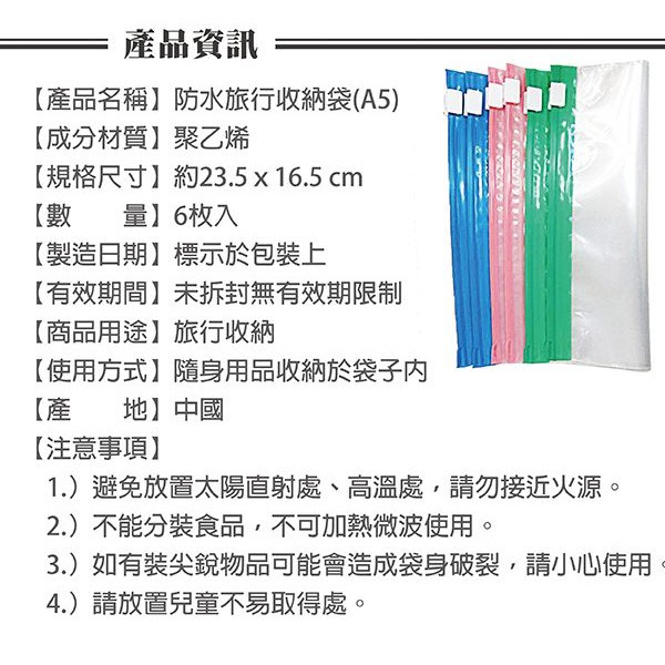 防水旅行收納袋(A5)6枚入 旅行 旅遊 出差 出國 旅行收納 收納包 防水收納 密封袋 拉鍊【小三美日】D373386