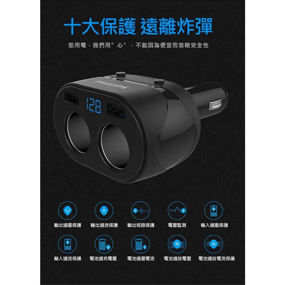 PHILIPS 飛利浦 DLP3521N 車充 一轉二 USBx2 4.8A 電壓顯示